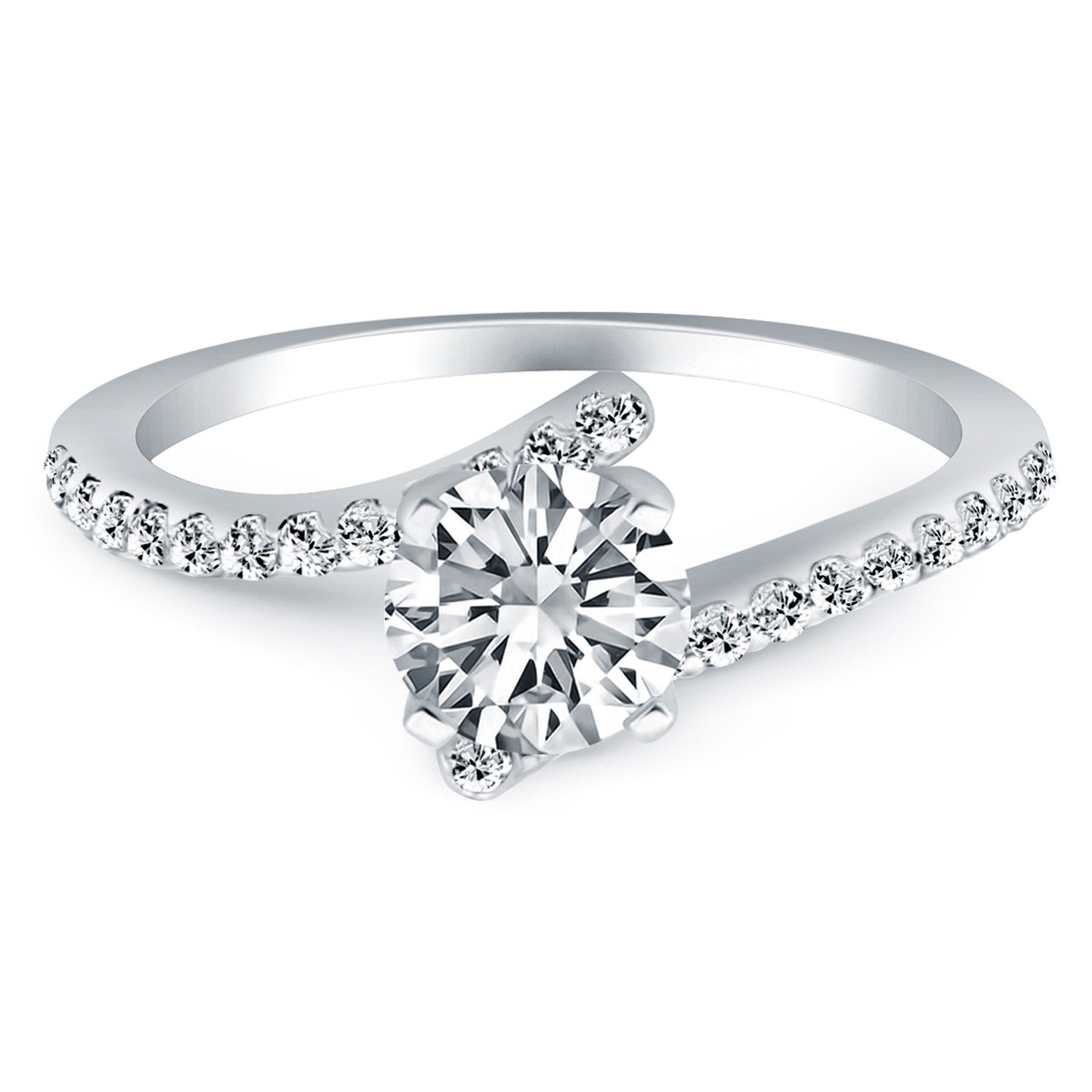 The journey of two lives joined by a precious commitment symbolized by your center stone is the inspiration for our stunning diamond, bypass engagement ring mounting. Able to accommodate a wide variety of center stone sizes and shapes, this slender and elegant ring set with glittering pave diamonds across the front of the 14k white gold highly polished band. The center highlights a sparkling 1/2 carat round cut diamond.